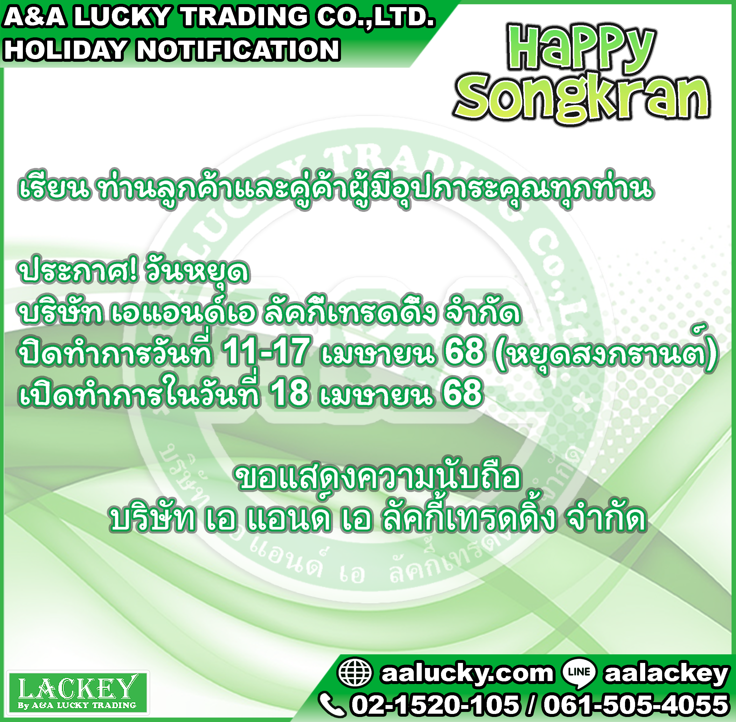 SONGKRAN CLOSURE 2568 เรียน ท่านลูกค้าและคู่ค้าผู้มีอุปการะคุณทุกท่าน ประกาศ! วันหยุดบริษัท เอแอนด์เอ ลัคกี้เทรดดิ้ง จำกัดปิดทำการวันที่ 11-17 เมษายน 68 (หยุดสงกรานต์) เปิดทำการในวันที่ 18 เมษายน 68 ขอแสดงความนับถือ บริษัท เอ แอนด์ เอ ลัคกี้เทรดดิ้ง จำกัด CONTACT US