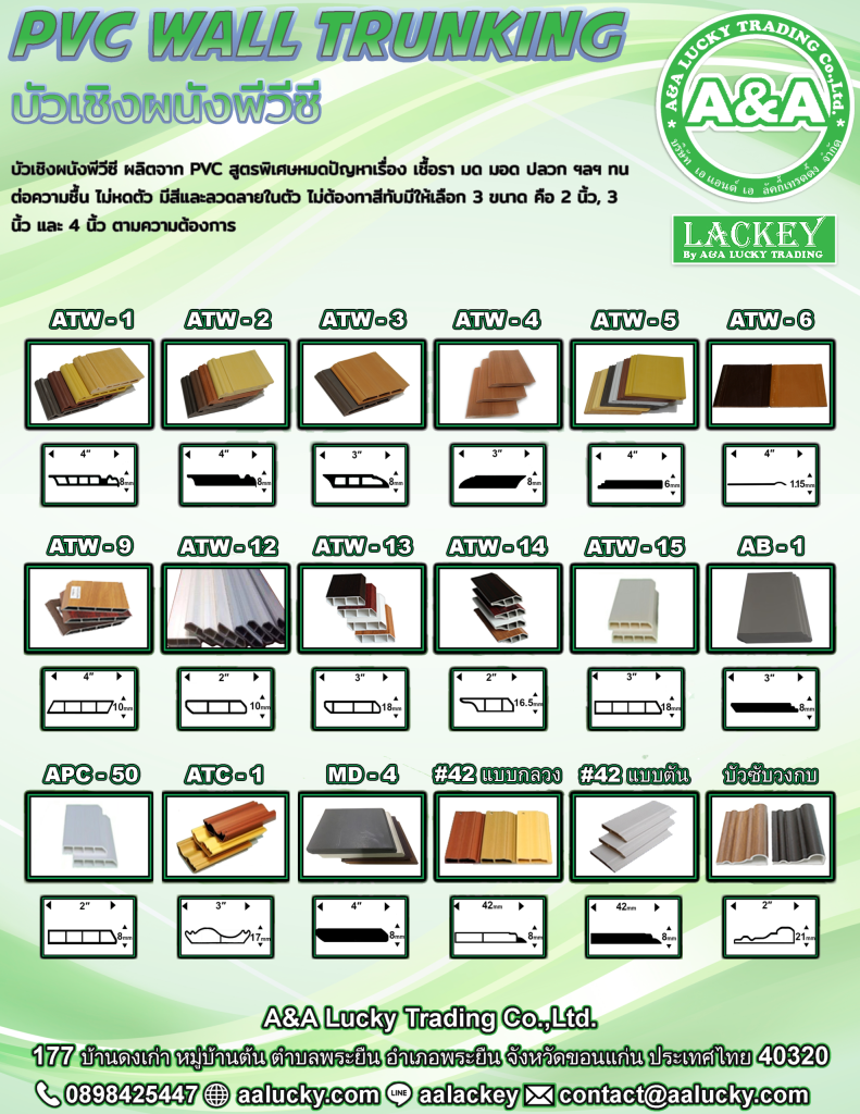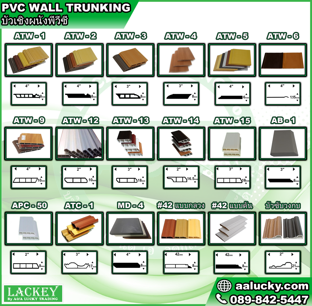 บัวเชิงผนังพีวีซี ผลิตจาก PVC สูตรพิเศษหมดปัญหาเรื่อง เชื้อรา มด มอด ปลวก ฯลฯ ทนต่อความชื้น ไม่หดตัว มีสีและลวดลายในตัว ไม่ต้องทาสีทับมีให้เลือก 3 ขนาด คือ 2 นิ้ว, 3 นิ้ว และ 4 นิ้ว ตามความต้องการวิธีการติดตั้ง ทำได้ 2 วิธ๊ คือ1.) ติดตั้งด้วย การทากาวเฉพาะ PVC มีขายตาม ร้านค้าทั่วไป ให้ทาเป็นลักษณะลูกลื่นคู่2 เส้น เว้นระยะห่างพอประมาณก่อนทากาวให้ใช้ผ้าแห้งเช็ดที่ผลิตภัณฑ์ และผนังให้สะอาดก่อน2.) การติดตั้งโดยการใช้ตะปู ควรใช้สว่านเจาะรูนําร่องก่อนและยึดด้วยตะปูเพื่อความสวยงามควรตอกเป็นคู่ และ เว้นระยะห่าง ประมาณ 70 ซม. – 80 ซม. แล้ว โป้วเก็บหัวตะปูให้ เรียบร้อย